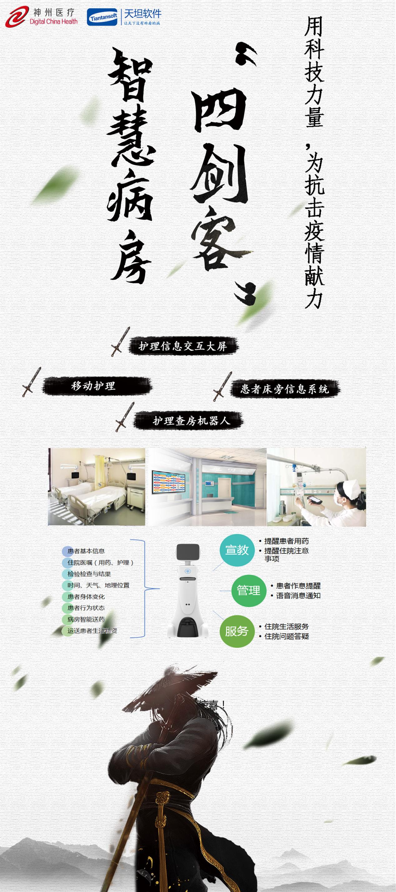 神州天坦智慧病房"四劍客",是神舟天坦憑借著十余年在醫(yī)療衛(wèi)生領(lǐng)域中豐富的行業(yè)經(jīng)驗積累,并針對此次新冠疫情防治的一線醫(yī)護人員日常工作需求,優(yōu)選出的可以快速搭建、臨床實用性高的智慧病房四大子系統(tǒng),具有很強的建設(shè)價值。以軟硬件、物聯(lián)網(wǎng)和人工智能技術(shù),構(gòu)筑起防治新型冠狀病毒的信息化關(guān)口,為醫(yī)護人員診療工作、患者住院服務(wù)進行保駕護航。以科技的力量為抗擊疫情獻力,我們一起攜手同行、共克時艱。贏得這場沒有硝煙的戰(zhàn)“疫”,中國加油!戰(zhàn)“疫”必勝!