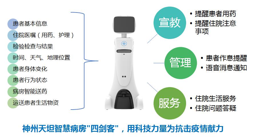 目前,疫情防控已經(jīng)進入最為關(guān)鍵的階段,無數(shù)奮戰(zhàn)在臨床一線的醫(yī)務(wù)工作者,正在冒著生命危險與病毒進行戰(zhàn)斗,為構(gòu)筑起防治新型冠狀病毒的信息化關(guān)口,有效降低病毒交叉?zhèn)鞑ワL險,提高醫(yī)護人員工作效率與安全性。神州天坦推出智慧病房"四劍客":患者住院信息服務(wù)系統(tǒng),護理信息交互大屏系統(tǒng),移動護理系統(tǒng)與護理查房機器人系統(tǒng),整合先進的軟硬件、物聯(lián)網(wǎng)和人工智能技術(shù),為奮戰(zhàn)在抗“疫”一線的醫(yī)護人員保駕護航。