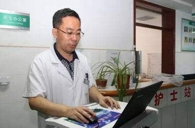 在呼吸內(nèi)二科,科主任韓先章已經(jīng)查完房在寫病歷。說起移動查房,韓先章說:用移動查房車,各種檢查一目了然,比翻病歷方便多了;看完病人立即下醫(yī)囑,又快又不會遺漏,我每次查房至少可以節(jié)約一個(gè)小時(shí)。而且無紙化辦公,節(jié)約了大量紙張,真是一舉多得。